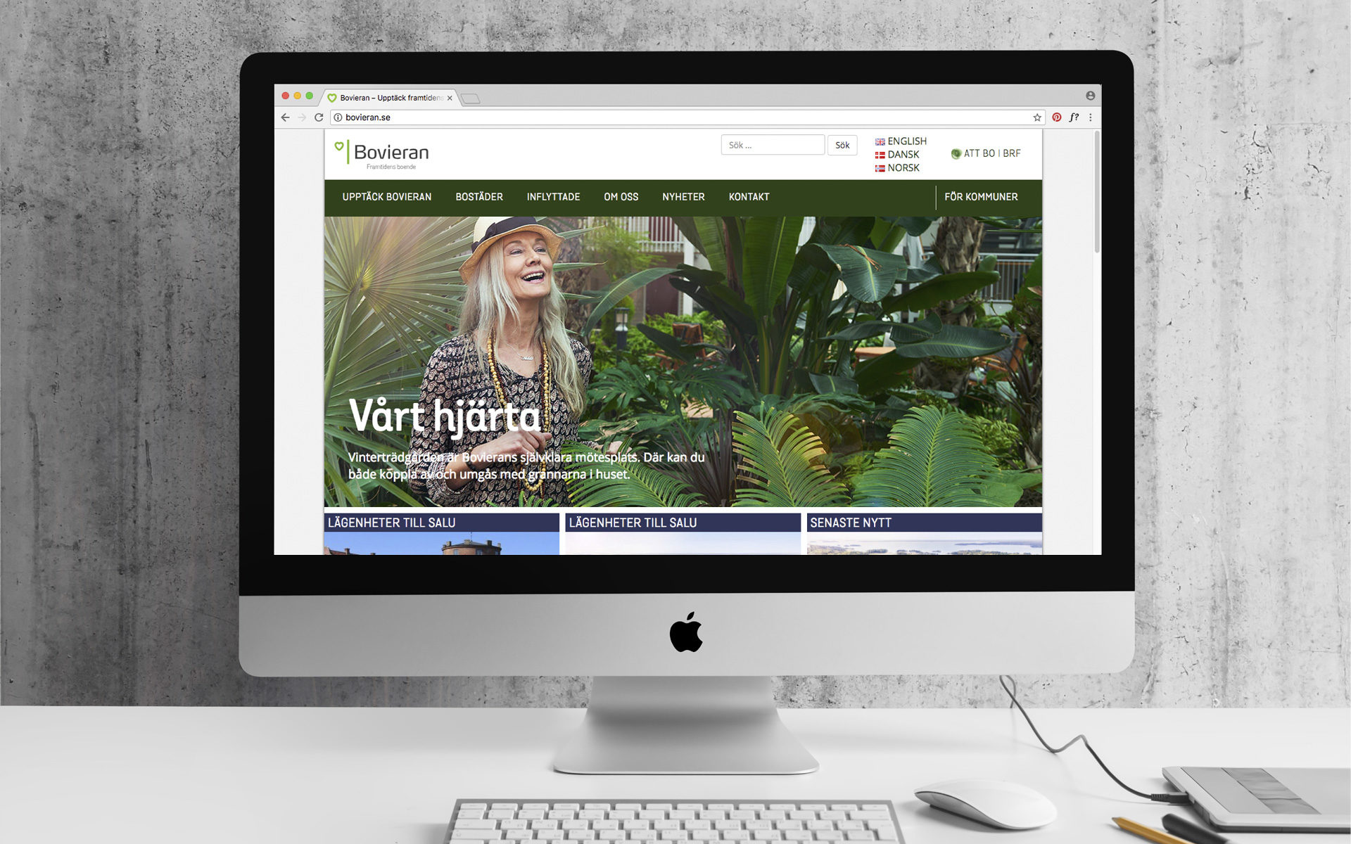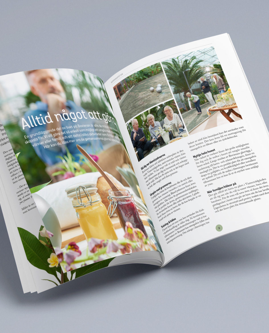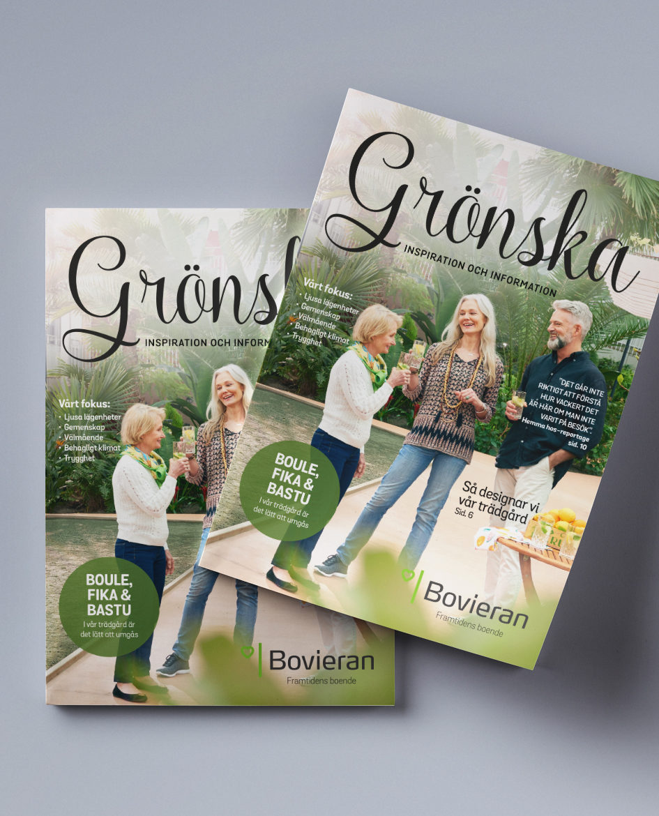 Vårt uppdrag har varit att via olika kanaler kommunicera de många sociala och trygghetsskapande vinster som boendekonceptet har. Vårt arbete inleddes med att stärka Bovierans närvaro digitalt, men växte snabbt till att omfatta varumärkesstrategi såväl som en ny grafisk profil och ett uppdaterat bildmanér. Sedan 2016 har vi tagit fram annonsmaterial för tryckta och digitala format, filmer, broschyrer, pressmaterial presentationer, magasin, nyhetsbrev och mycket brev.
