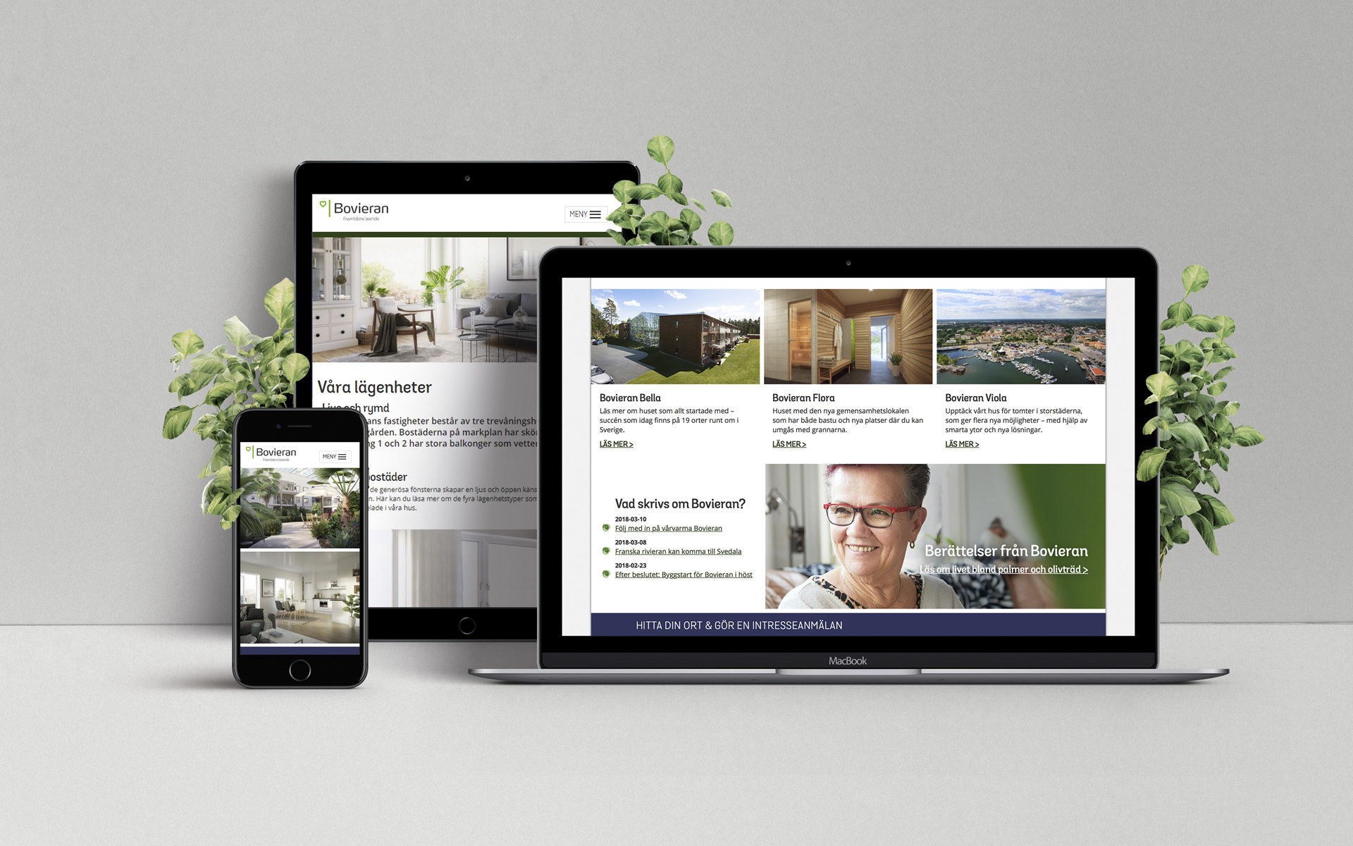 I början av 2017 lanserades även nya Bovieran.se. Med den nya siten ville vi dels göra det enklare för Bovierans potentiella köpare att hitta information om olika lägenhetsalternativ och att lära sig mer om den unika boendeformen. På siten ville vi även ge besökarna chansen att läsa om vad de som bor i Bovierans hus idag tycker – och att se både bilder och rörligt material från de olika husen. Utöver det ville vi även skapa innehåll anpassat för två andra viktiga målgrupper för Bovieran: kommunen och de befintliga boende. Oavsett anledning till att besöka siten skulle det bli smidigt att lära sig mer och höra av sig via olika kontaktvägar.