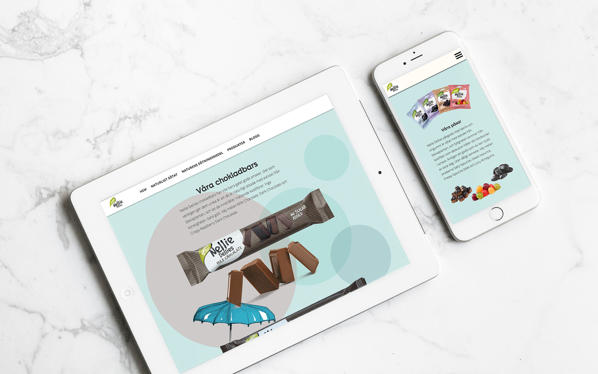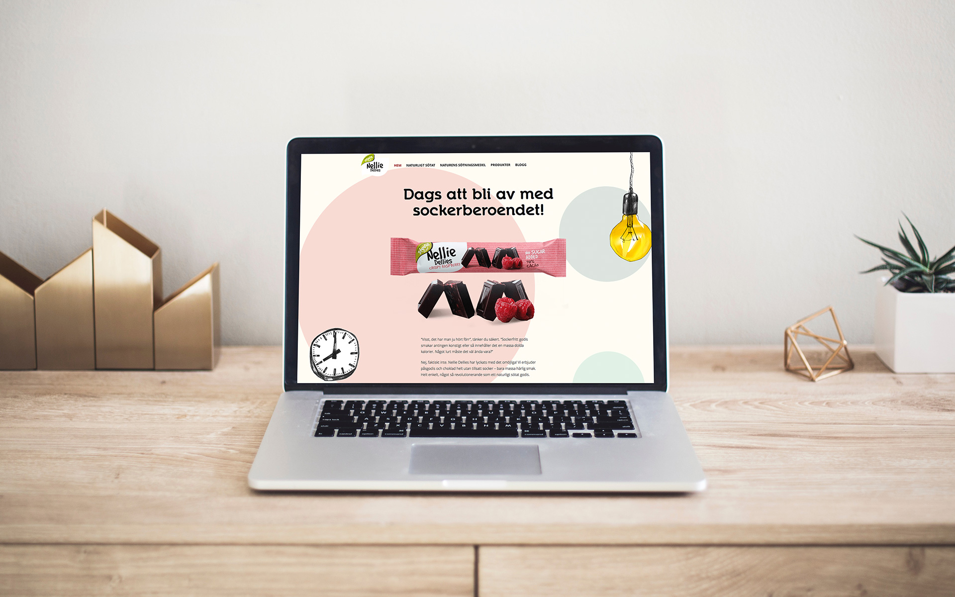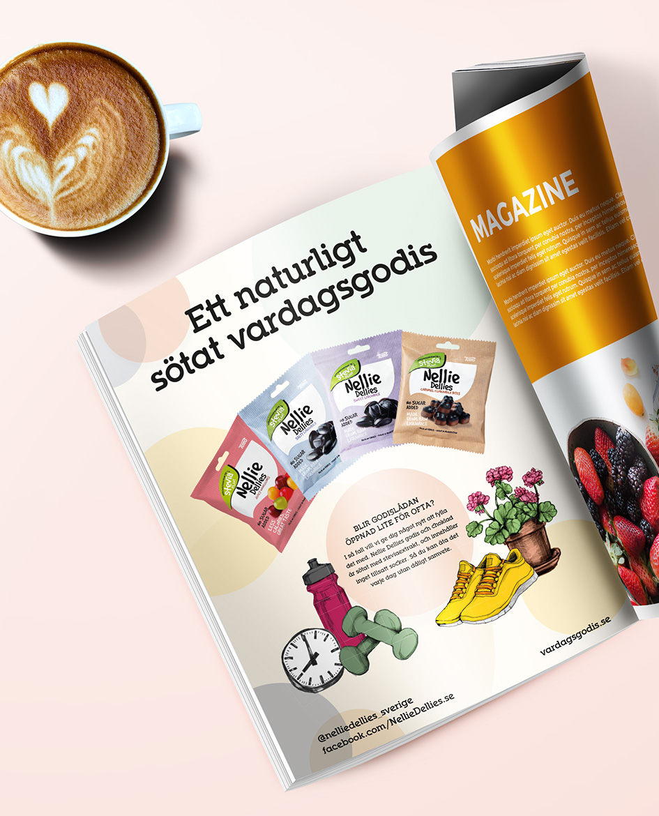 Inför lanseringen tog vi fram Nellie Dellies hemsida, vardagsgodis.se, plus en Facebooksida för varumärket. Vi tog även fram hyllvippor och toppskyltar för de butiker där Nellie Dellies skulle säljas. Därtill producerade vi annonser, vykort och ett PR-utskick som gick ut till utvalda bloggare tillsammans med smakprov på godiset. I de olika enheterna lyfte vi vardagssituationer på olika sätt, med bilder och rubriker som fångade känslor och händelser som målgruppen skulle kunna relatera till. Det gjorde vi med rubriker som: "Åh-värsta-klockan-tre-dippen-godis", "Inte-ge-vika-för-galet-sötsug-godis" och "Jag-hinner-inte-hem-innan-mötet-godis".